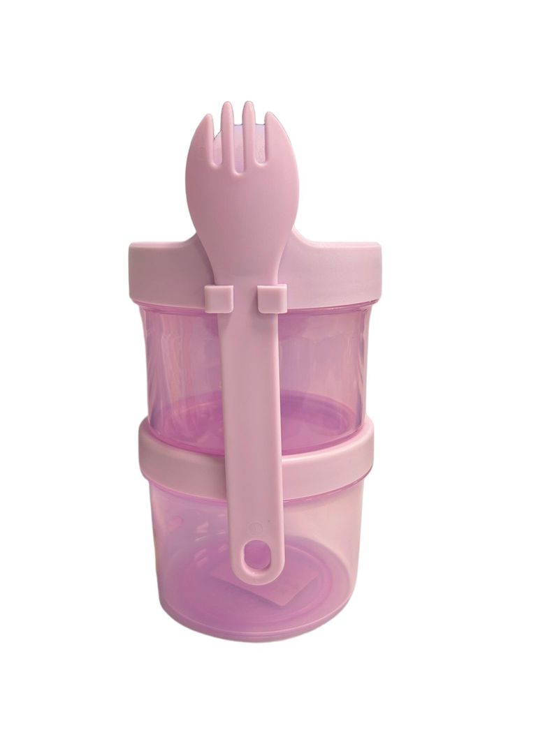 - Cubierto Integrado: Incluye un práctico cubierto 2 en uno (cuchara-tenedor) que se sujeta de forma segura al lateral del contenedor para que nunca se pierda.