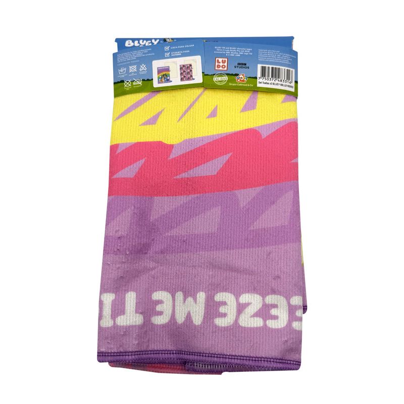 • Diseño "Squeeze Me Tight!": La primera toalla destaca por una ilustración encantadora de Bluey y Bingo abrazadas sobre un fondo de arcoíris multicolor y corazones, con el mensaje "Squeeze Me Tight!" en la parte superior.