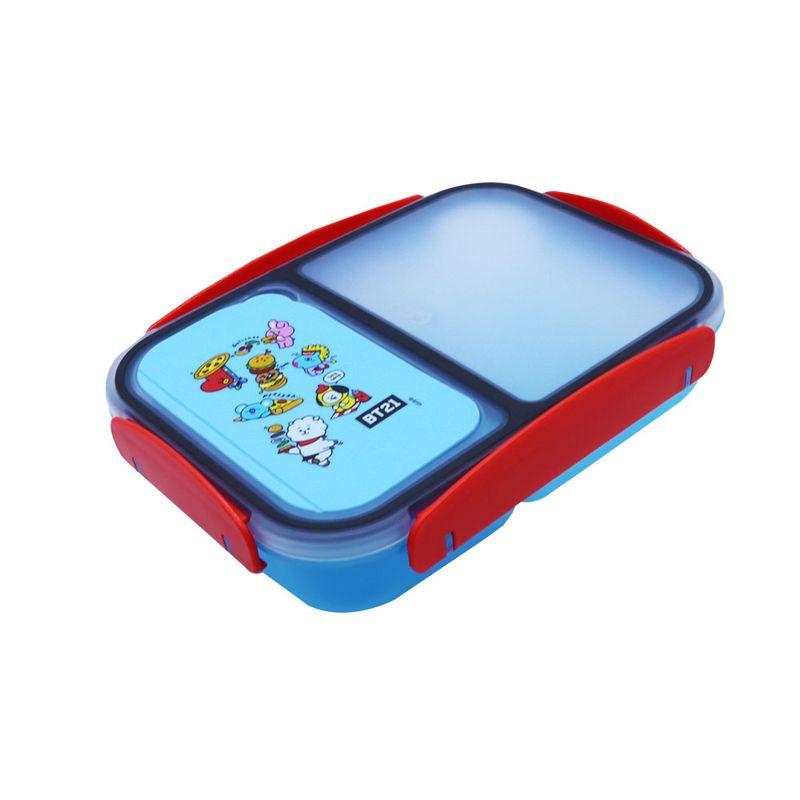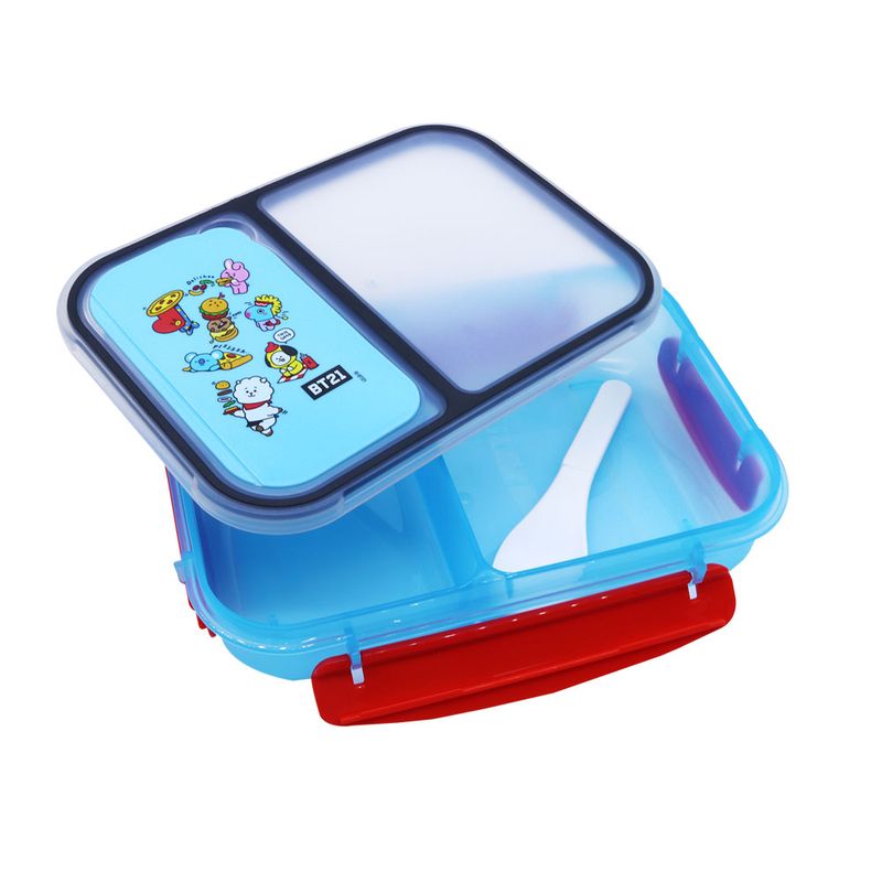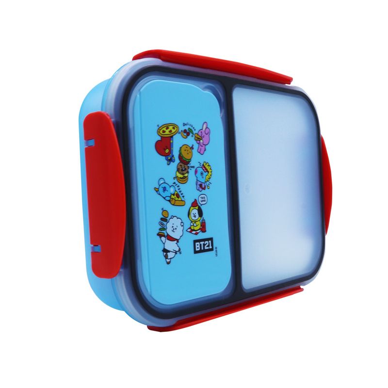 - Diseño "Foodie" BT21: La tapa presenta ilustraciones vibrantes de los personajes de BT21 disfrutando de snacks como pizza, hamburguesas y malteadas, aportando un estilo alegre a la hora de comer.