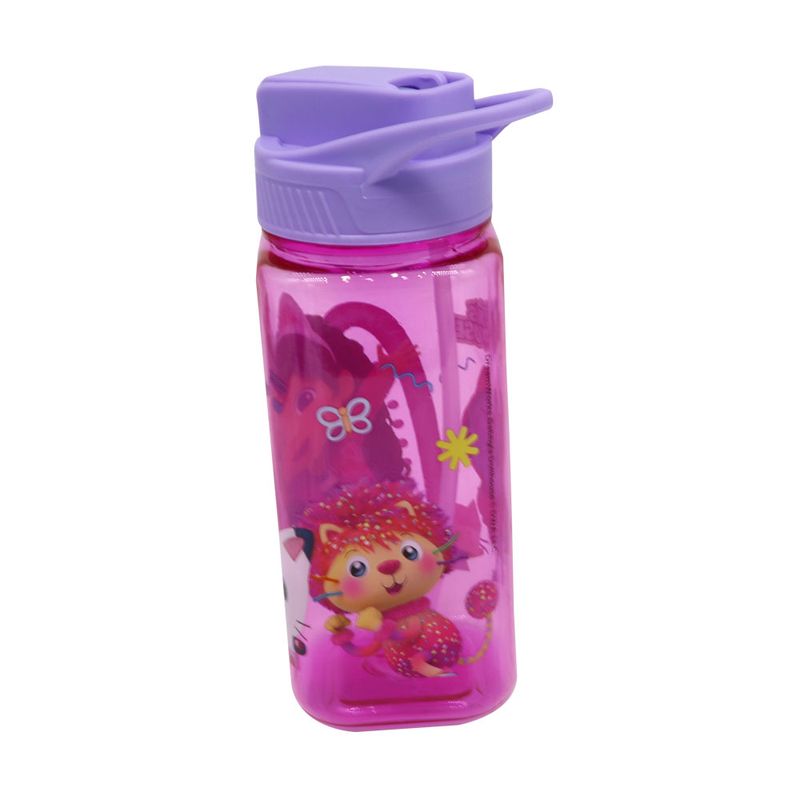 • Diseño Vibrante de Gabby: El cuerpo de la botella es de un color fucsia transparente y cuenta con ilustraciones encantadoras de Gabby junto a sus amigos gatitos, decoradas con motivos de estrellas, flores y notas musicales.