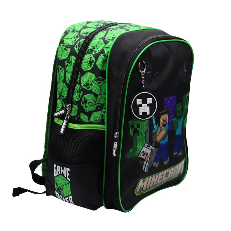 • Accesorios de Colección: Viene acompañada de un llavero decorativo circular con la cara de un Creeper y tiradores de cremallera metálicos personalizados con el logo de Minecraft para un acceso rápido.