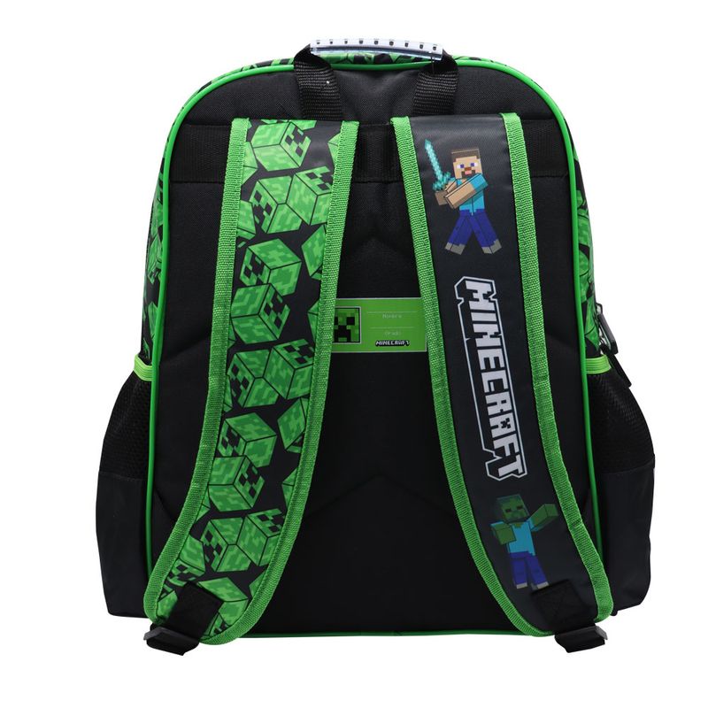 • Confort Ergonómico: Cuenta con asas acolchadas y regulables decoradas con cubos de Minecraft y personajes, diseñadas para brindar el máximo cuidado a los hombros durante el uso diario.