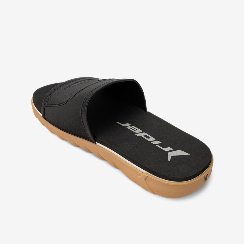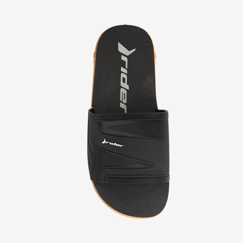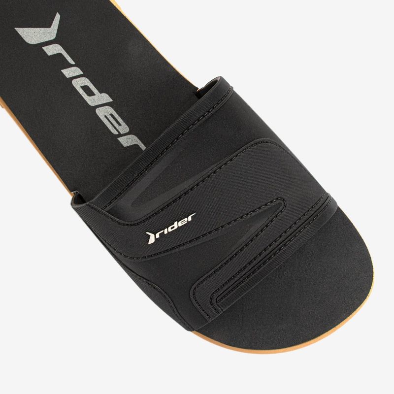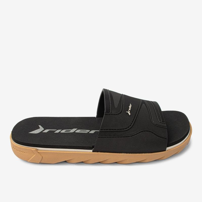 La sandalia slide casual de hombre, de la marca Rider, es la opción deportiva y ultraligera para el Verano. Presenta una banda NEGRA ancha sobre una suela robusta en tono CAMEL, ideal para el descanso, piscina o un look de calle relajado.